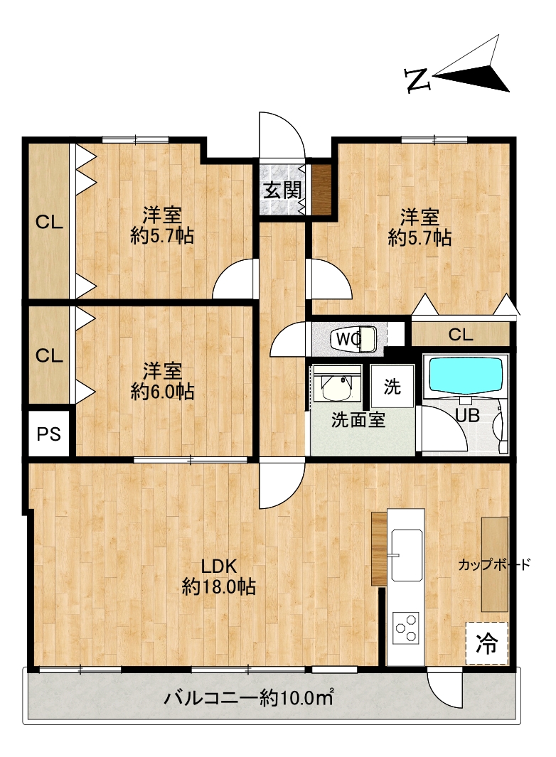 RC造7階建・平成12(2000)年10月築・総戸数130戸・3LDK・西向きテラス・全居室5.5帖以上+収納付きでお部屋をスッキリご利用いただけます。